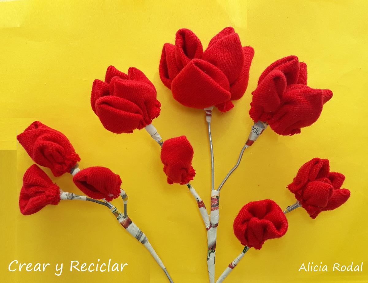El primer ramo de flores será una linda imitación de rosas rojas, por la textura y el color de la tela. Podemos hacerlo de diferentes formas, según la manera en que recortemos las piezas para hacer los pétalos y la cantidad que queramos poner.Flor de 7 pétalos idea # 1