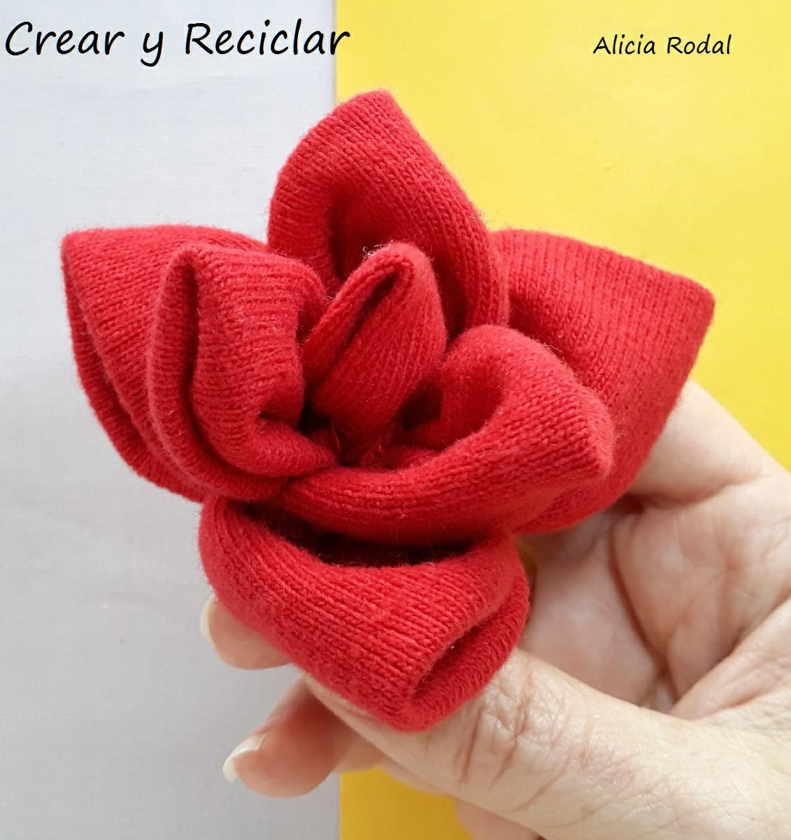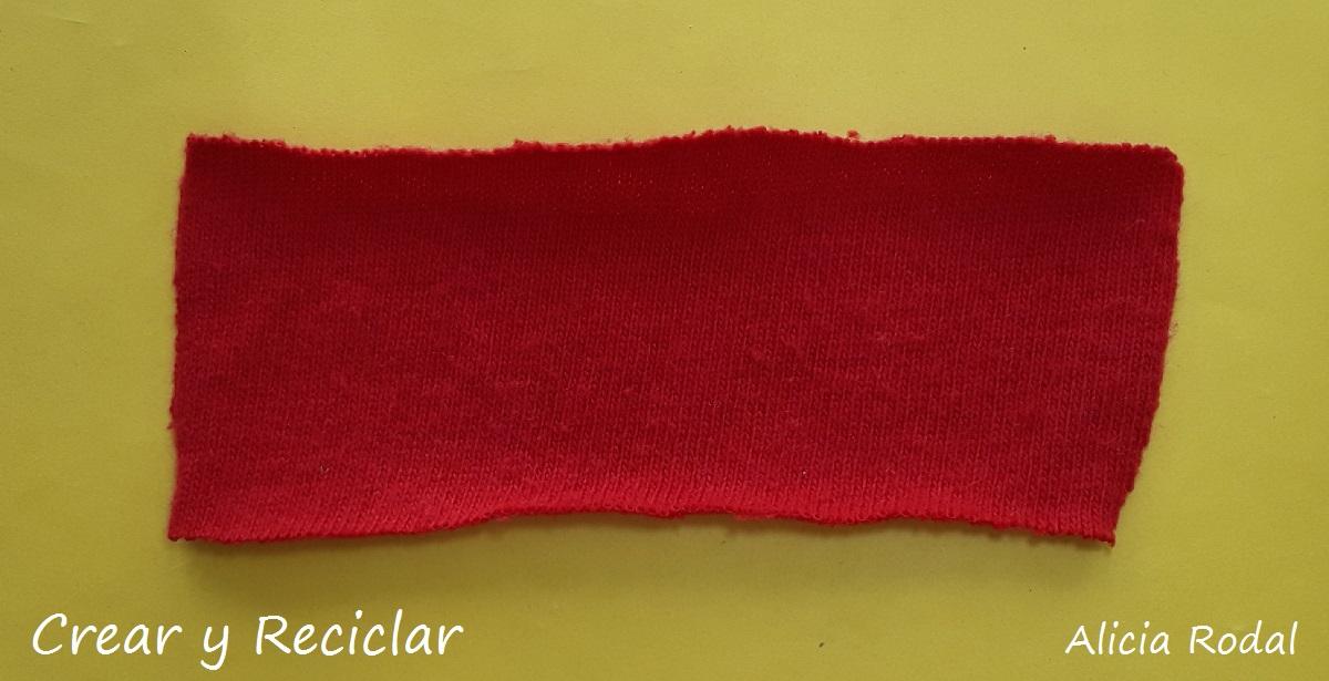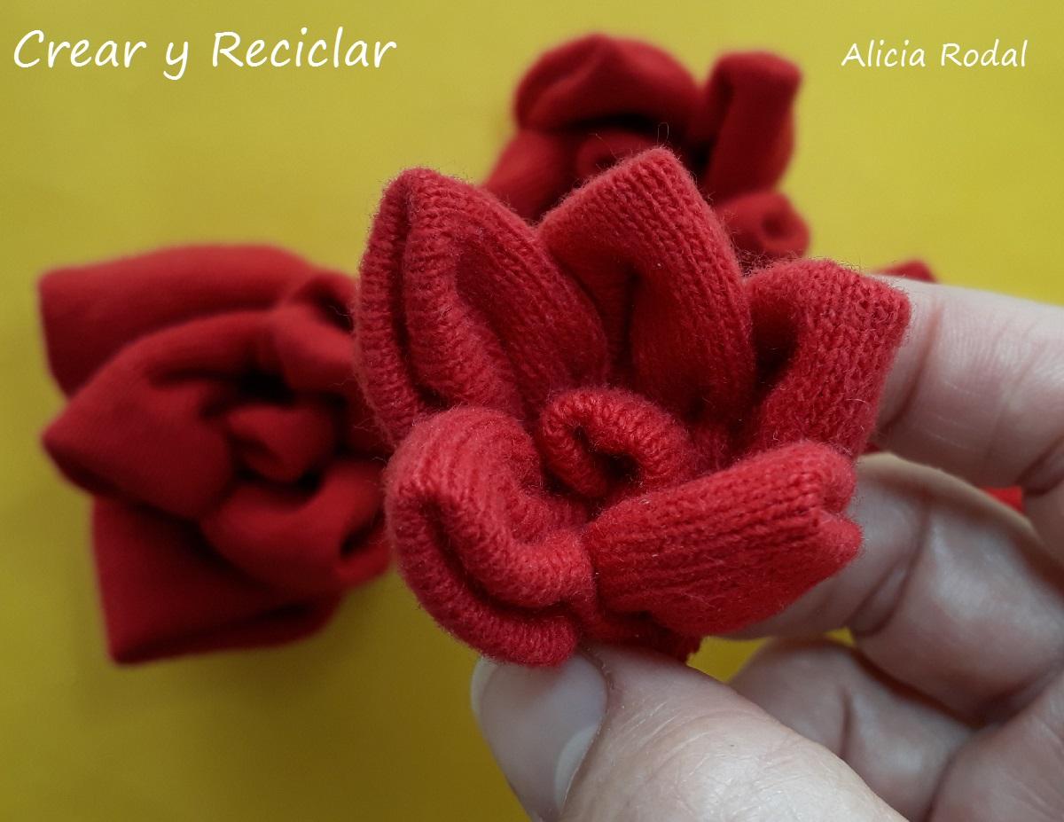 Yo voy a reutilizar una tela de tejido de punto en color rojo, de poliéster y un poco de lana. Este tejido es un poco grueso, con lo cual conseguiremos una flor con mucho cuerpo.
