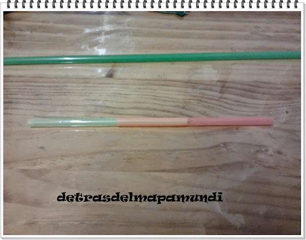 4.- corto en longitudinal una de las pajitas para cerrarla un poco más e introducirla en la otra, y luego la corto en tiras pequeñitas.