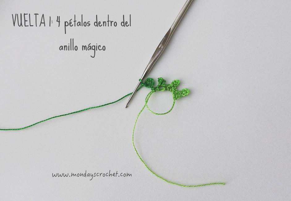 VUELTA 1: Tejemos 1 c.a.d. de subida, 1 p.b. dentro del anillo mágico, 5 c.a.d, 1 p.c. en la primera c.a.d. para cerrar el primer pétalo, 1 c.a.d. de separación. Repetimos *1 p.b. en el anillo mágico, 5 c.a.d, 1 p.c. en la primera c.a.d. para cerrar el pétalo y 1 c.a.d. de separación* 3 veces más. Cerramos con 1 p.c. En total 4 pétalos de 5 c.a.d.
