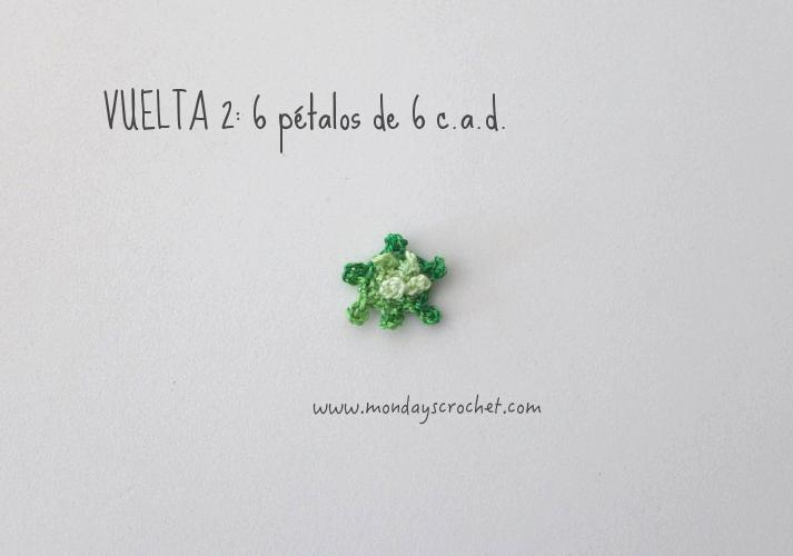 VUELTA 2: Tejemos 1 c.a.d. de subida y 1 p.b. en el p.b. de la vuelta anterior, 6 c.a.d, 1 p.c. en la primera c.a.d. para cerrar el primer pétalo, 1 c.a.d. de separación. Repetimos *1 p.b. detrás del primer pétalo de la vuelta anterior, 6 c.a.d, 1 p.c. en la primera c.a.d. para cerrar el pétalo y 1 c.a.d. de separación* 2 veces más. Continuamos con 1 p.b. entre los pétalos 2 y 3 de la vuelta anterior, 6 c.a.d, 1 p.c. en la primera c.a.d. para cerrar el pétalo y 1 c.a.d. de separación. Repetimos *1 p.b. detrás del tercer pétalo de la vuelta anterior, 6 c.a.d, 1 p.c. en la primera c.a.d. para cerrar el pétalo y 1 c.a.d. de separación* 2 veces más. Cerramos con 1 p.c. En total 6 pétalos de 6 c.a.d.