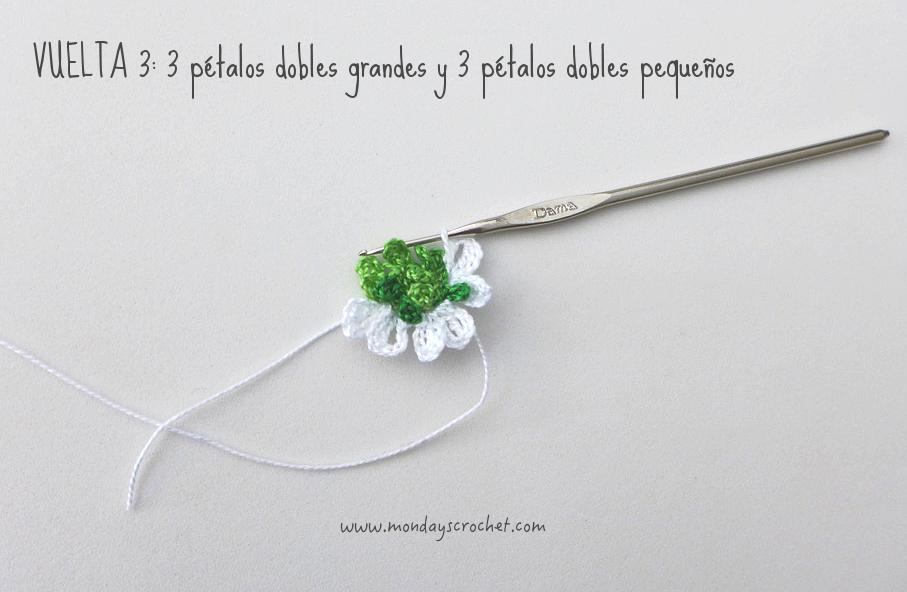 VUELTA 3: Tejemos 4 c.a.d. de subida, 1 p.a.d., 4 c.a.d. de bajada y 1 p.c. Repetimos 4 c.a.d. de subida, 1 p.a.d., 4 c.a.d. de bajada y 1 p.c. Hemos tejido los 2 primeros pétalos grandes. Pasamos al siguiente espacio entre pétalos de la vuelta anterior con 1 c.a.d. de separación. Repetimos *1 p.c., 4 c.a.d. de subida, 1 p.a.d., 4 c.a.d. de bajada, 1 p.c., 4 c.a.d. de subida, 1 p.a.d., 4 c.a.d. de bajada, 1 p.c. y 1 c.a.d. de separación* 2 veces más. Hemos tejido 3 grupos de pétalos grandes. A continuación hacemos 3 grupos de pétalos pequeños. Tejemos 1 p.c., 5 c.a.d., 1 p.c., 5 c.a.d., 1 p.c. y 1 c.a.d. de separación. Repetimos *1 p.c., 5 c.a.d., 1 p.c., 5 c.a.d., 1 p.c., 1 c.a.d. de separación* 2 veces más. Terminamos con 1 p.c. En total 3 grupos de pétalos grandes y 3 grupos de pétalos pequeños.
