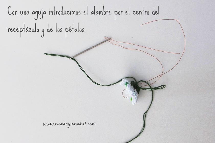 Introducimos con una aguja el alambre por el centro de la flor, desde detrás hacia delante y otra vez desde delante hacía detrás. De manera que queden fuera los 2 extremos del alambre.