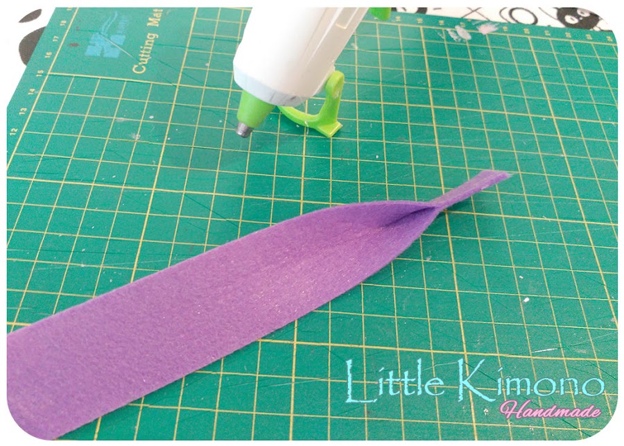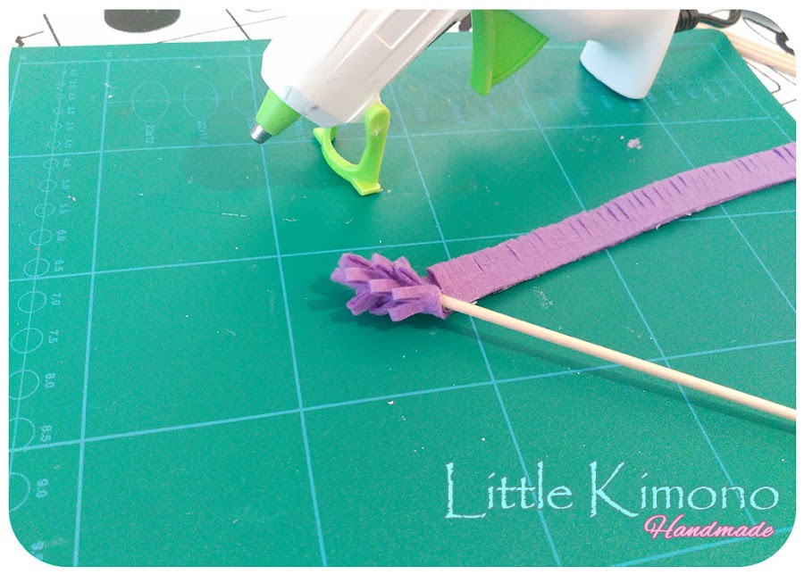 4. Pegamos un extremo de la tira de fieltro en la punta plana del palo de brocheta (el lado opusto a la punta) y vamos enrollándola por todo el palo...