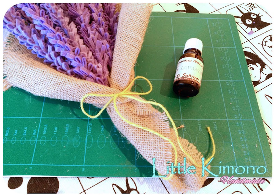 6. Por último cuando tengamos todas las flores acabadas envolvemos en un trozo de arpillera como si fuese un ramo y atamos con cuerda de yute, incluso podemos agregar gotas de aceite esencial de Lavanda... ◠‿◠