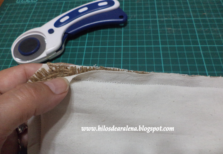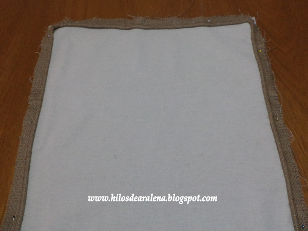 Para comenzar forré un cordón con arpillera , fijándolo con un pespunte y dejando un margen de tela para poder unirlo al almohadón con comodidad ya que se deshilacha muy fácil.