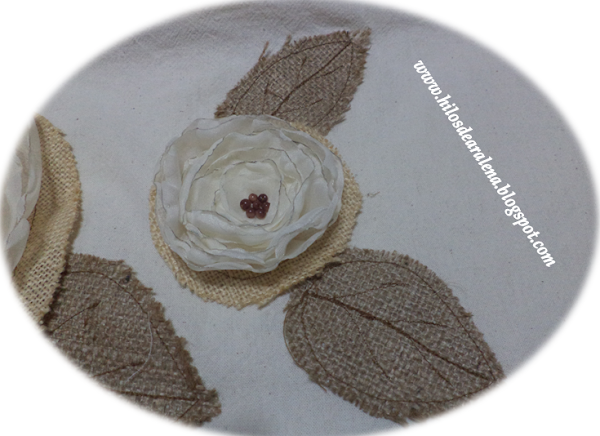 Coloqué primero las hojas en arpillera marrón y las fijé con pespunte en un tono de hilo mas oscuro, que se note un poquito. Sobre todo para marcar las nervaduras.