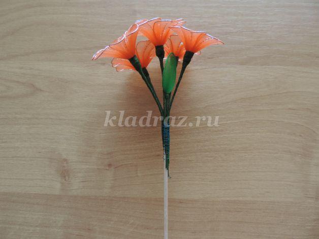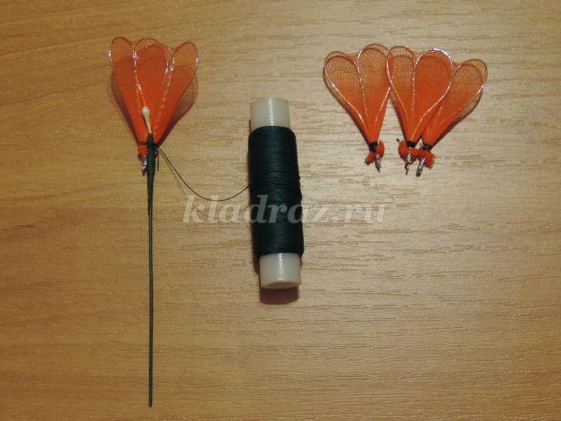 En el paso siguiente vamos a juntar 5 pétalos en un alambre con un estambre artificial en el extremo.