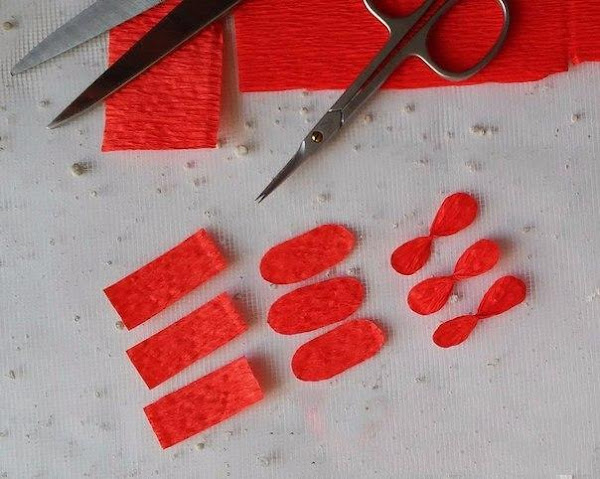 2.-Corta 3x5 cm de papel crepe ( estos serán pequeños rectángulos). Para hacer una flor, solo corta 3 piezas de este papel.