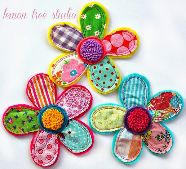 Estas flores de patchwork son de lemon tree studio y las han hecho a partir de una base de fieltro con la forma de la flor y cosiendo encima de cada pétalo una tela estampada con diferentes motivos, pero dejando ver el color del fieltro que hay por debajo. En el centro han cosido un círculo de fieltro y encima hay una flor que parece de plástico y que podría ser un botón, o una figura de otro tipo.