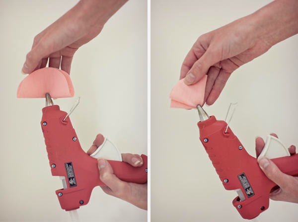Recortamos varios círculos en la tela o fieltro, doblamos al medio, usamos una gotita de silicona y pegamos, como se ve en la imagen.