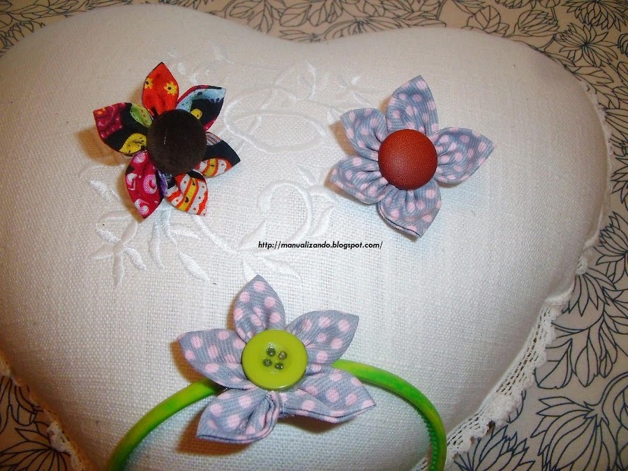 En esta manualidad os muestro como hacer unas bonitas flores de tela. Para ponerlas en cintas para el pelo, diademas, bolsos, broches etc. ¿ Se te ocurren más a tí? Seguro que si. Materiales 10 Cuadrados de tela de 7 x 7 cm Aguja e hilo Un trocito de fieltro Tijeras Silicona caliente Una piedrecita brillante o un botón Doblamos cada cuadrado de tela a la mitad para luego bajar hacia abajo los ex ...