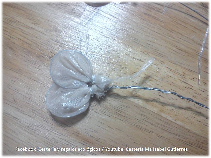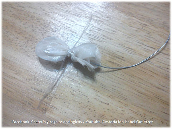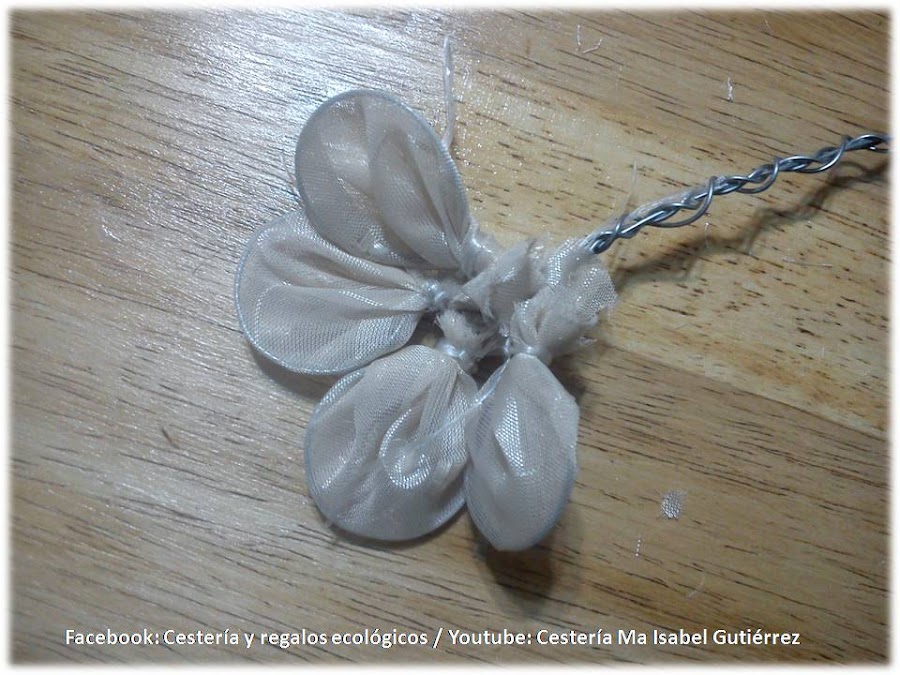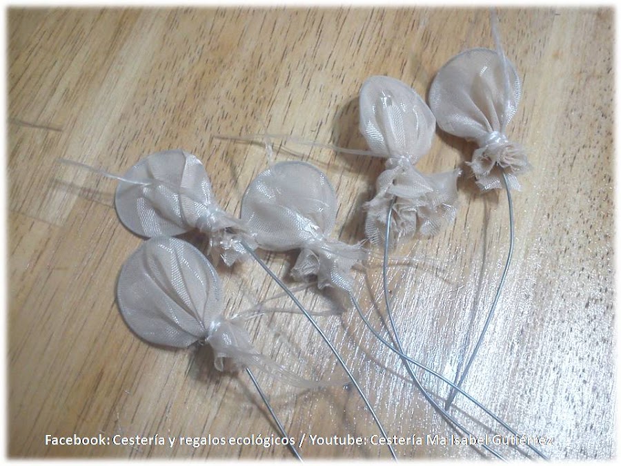 Recogemos los extremos de la tela en la parte baja del pétalo de alambre y amarramos con un hilo delgado y fuerte, yo utilicé cordones de plástico que es con lo que viene amarrado las cajas de huevos...