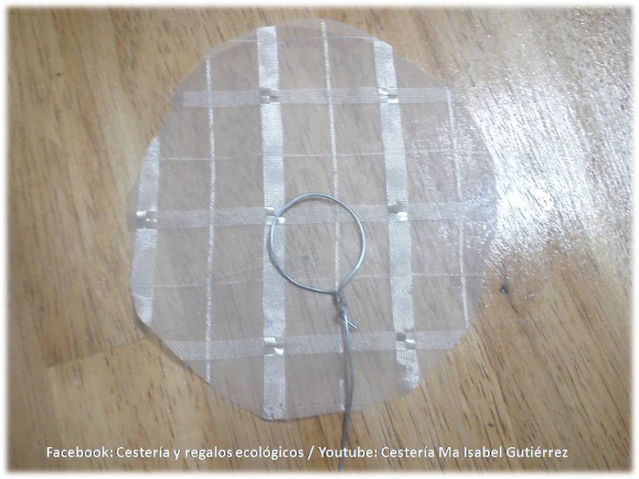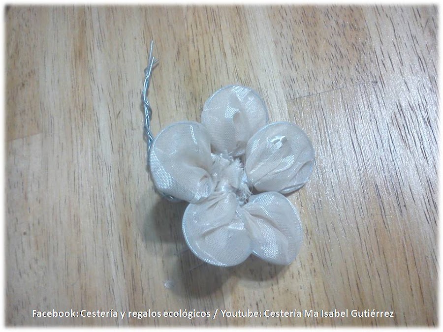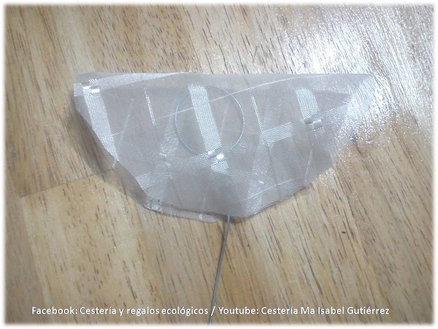 Acomodamos el pétalo de alambre en el centro de la rueda de tela, doblamos a la mitad...