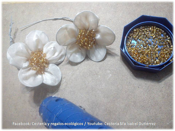 El centro lo podemos decorar de diversas maneras: podemos pegar algún botón grande, falsas gemas, o como yo lo hice: rellené con silicón caliente todo el centro y dejé caer chaquiras de un color contrastante (la chaquira son pequeñas cuentas de plástico que se usa en bisutería, las consigues muy económicas en tiendas de manualidades)...