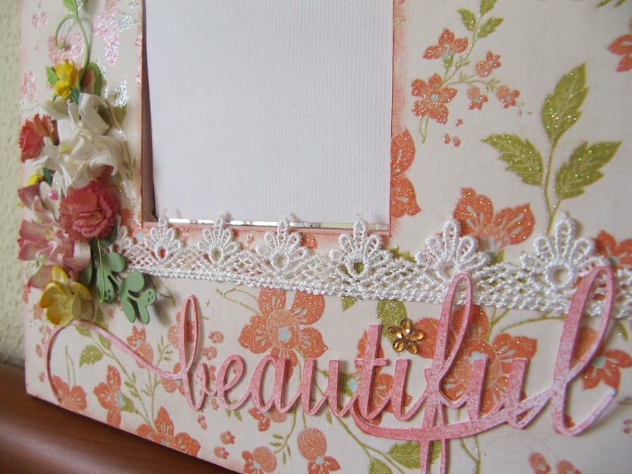 Cuando estaba haciendo este espejo, pensé que hacía tiempo que no hacía nada con flores, y eso que me gusta mucho trabajar con ellas!, son las protagonistas del espejo, en donde utilice sólo un papel precioso de unas flores con brillo y relieve, la palabra esta hecha con la Cameo, cortada varias veces para darle volumen y rociada con tinta en spray, una mariposa grandecita de metal y para terminar una puntilla dándole más romanticismo