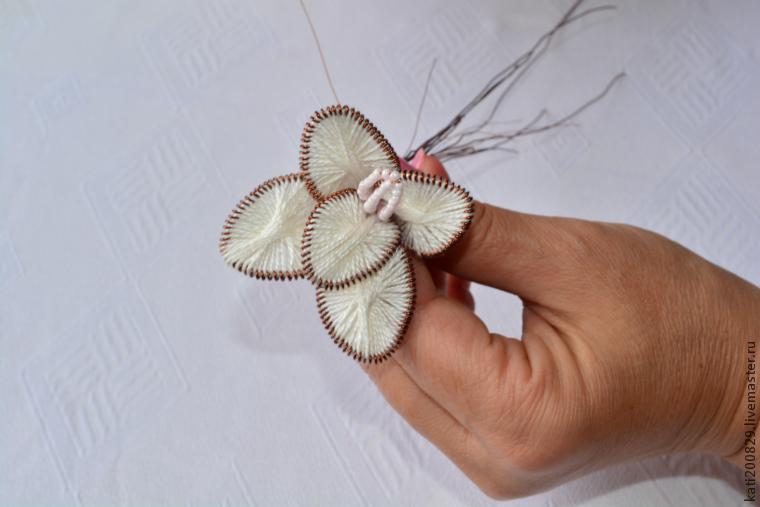 Para una flor de nuestro ejemplo necesitamos 5 pétalos iguales. El centro se elaborar de chaquiras juntadas en un alambre fino.