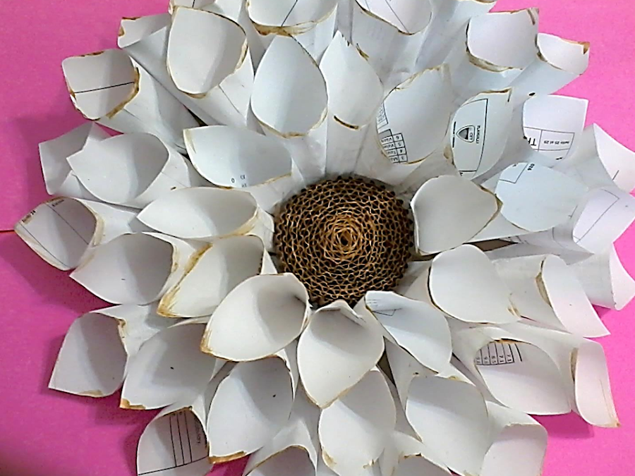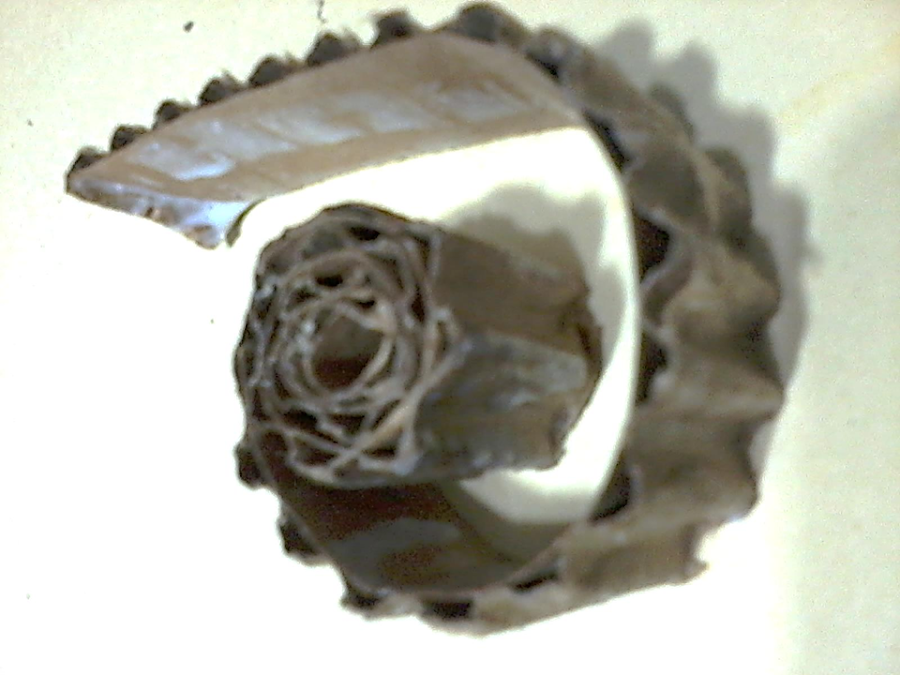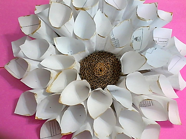 Ponemos pegamento o silicón a lo largo de una tira, por la parte lisa y empezamos a enrollar sobre sí misma, vamos pegando alrededor mas tiras de cartón hasta obtener la medida del centro de la flor.