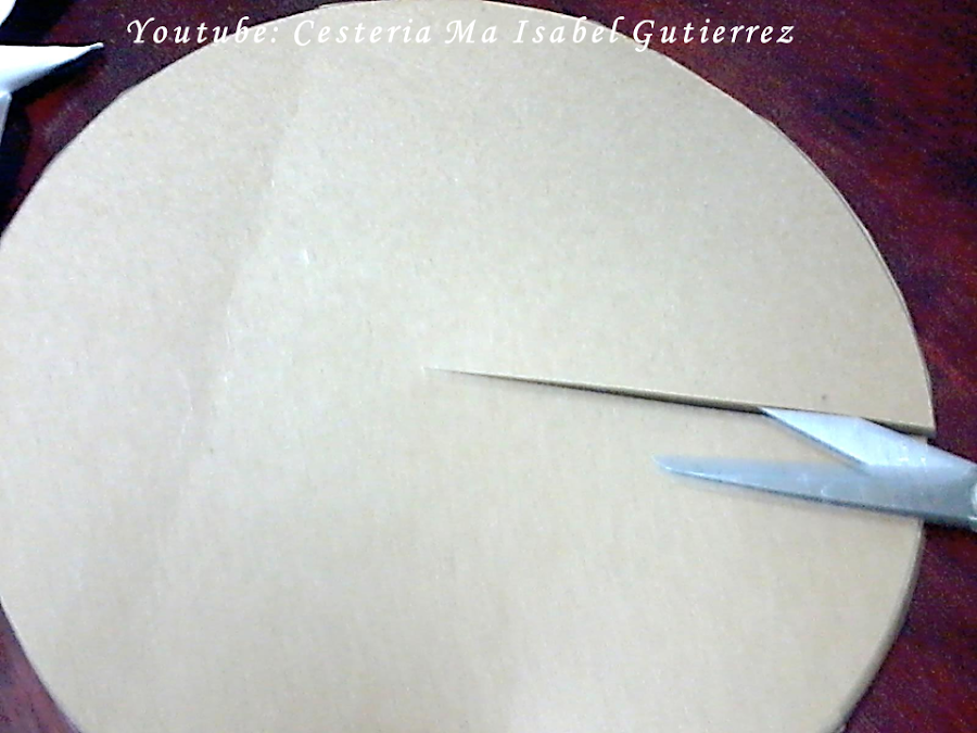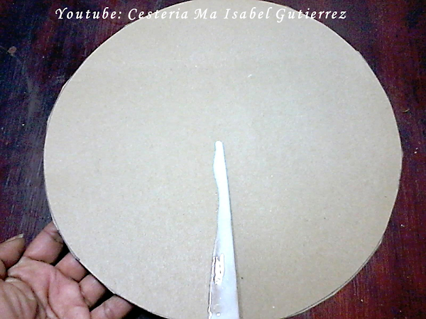 Aparte, con un plato, dibujamos y cortamos una rueda de cartón flexible del tipo de caja de cereales; enseguida, hacemos un corte desde una orilla de la rueda hasta el centro como se ve en la imagen.