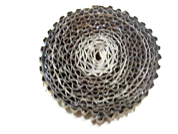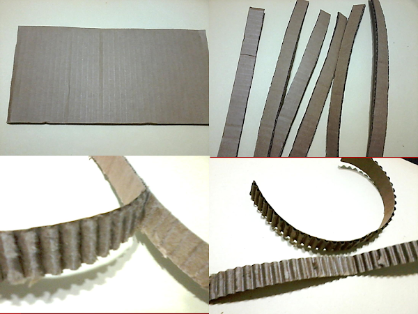 Aparte, cortamos tiras de cartón, de aproximadamente 15 cms., de largo y un centímetro de ancho; quitamos la capa de cartón de un lado de las tiras, de manera que nos queden tiras de cartón ondulado.
