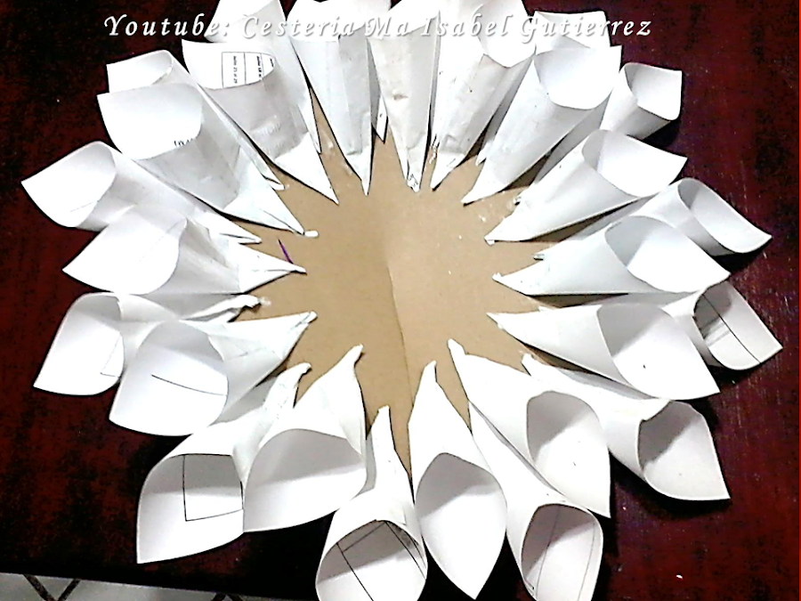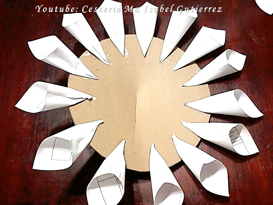 Damos vuelta a la rueda de cartón y pegamos, sobre las orillas, los conos de papel, doblando un poco las puntas de los conos para que se adhieran bien al cartón, dejamos un espacio de entre 3 o 4 cms., entre cada cono.