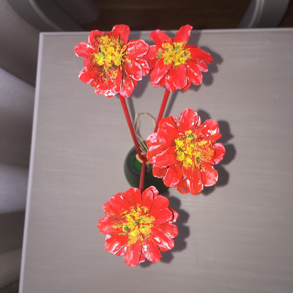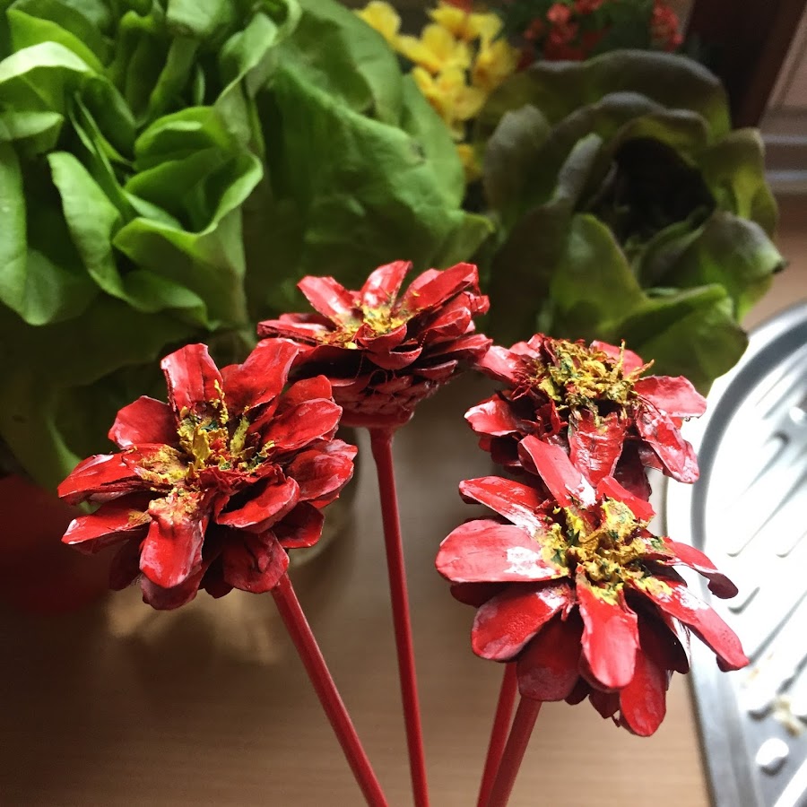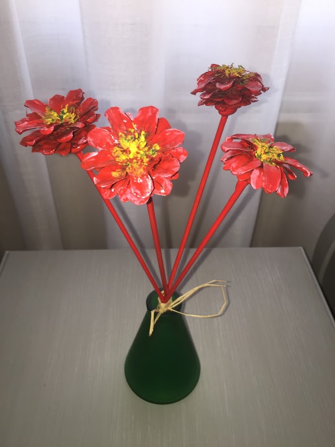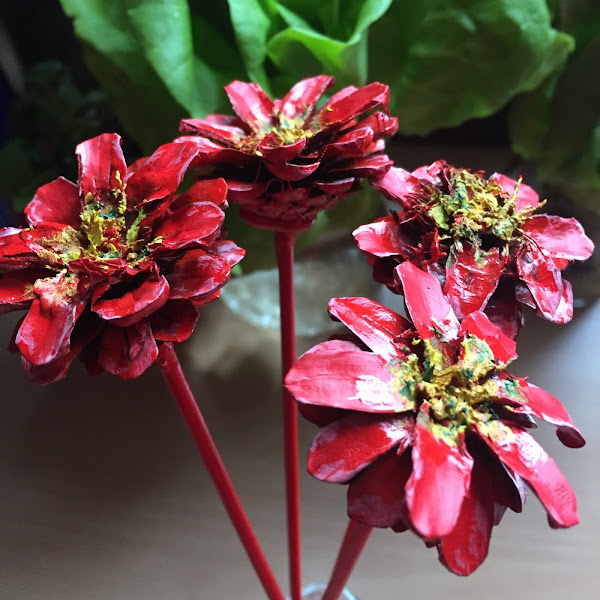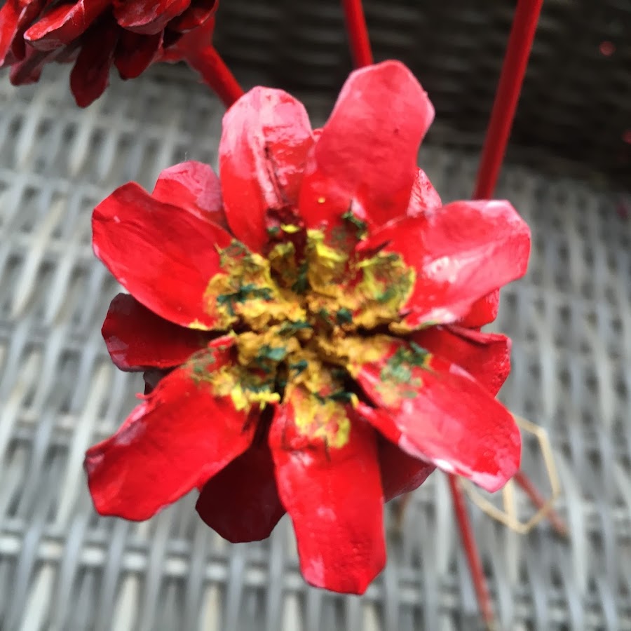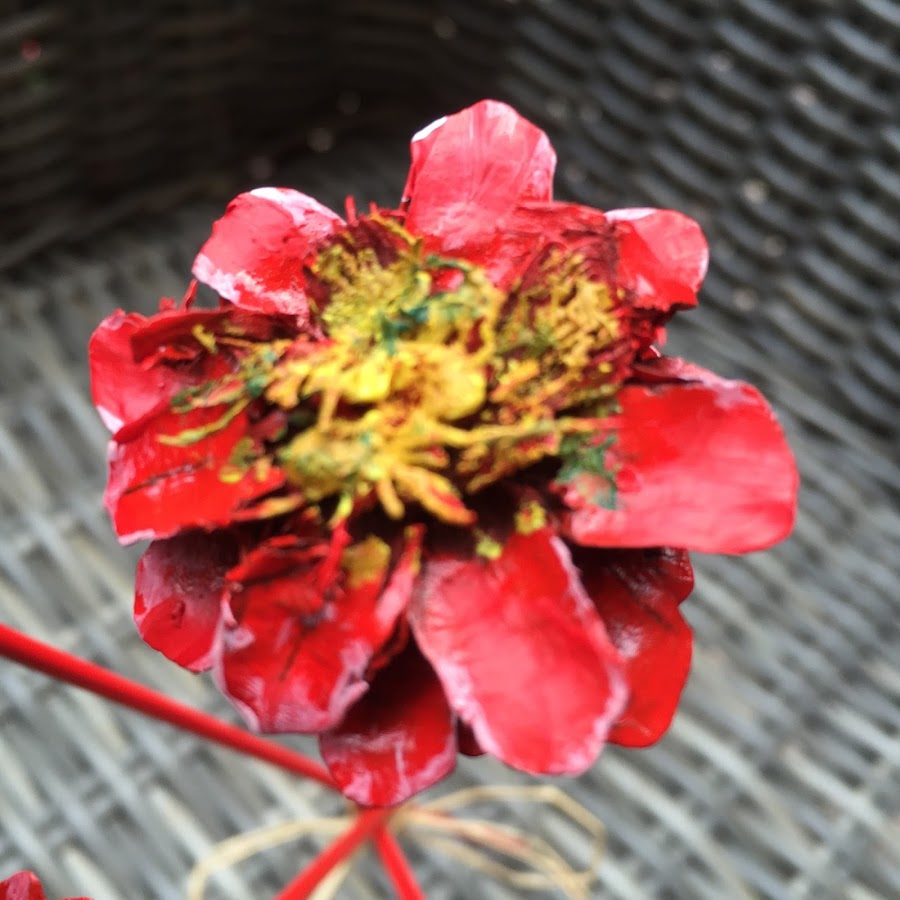 - Pintamos con pintura roja en spray. Una vez seca (al menos un día), pintamos el centro de "la flor" con pinceladas de pintura amarilla, ocre y verde.