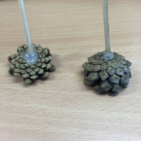 - A la base de cada piña le pegamos un pincho de esos de madera para los pinchos morunos. Lo pegamos con una pistolita de silicona caliente. Una vez pegados los pinchamos en un trozo de poliespan.
