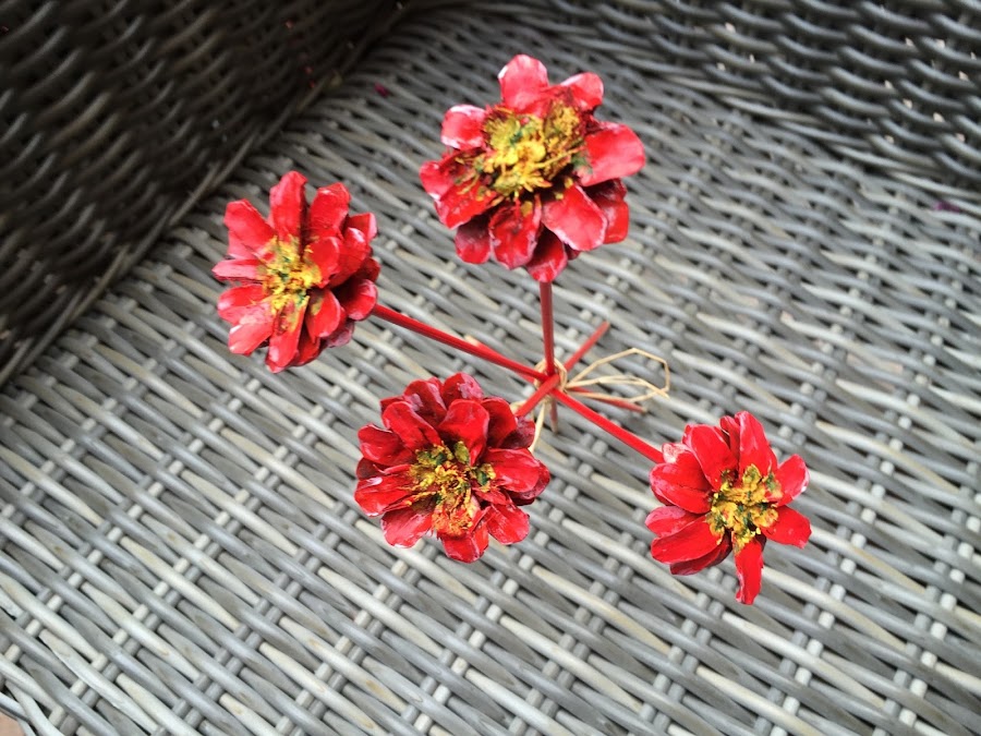 En cuanto a la pintura diré que fue un compendio de pinturas (la idea inicial era haber usado pintura acrílica). El spray era uno rojo que compré en los chinos (supongo que un esmalte). Para el centro usé unas supestas pinturas acrílicas que compré también en los chinos....pero que al abrirlas ponía "OIL", de hecho olían a pintura al óleo y me tocó limpier luego con aguarrás (un día subiré un post de "Cosas que no se deben comprar en los chinos", aunque como le deje por más tiempo la lista se me va a hacer interminable!!!). Por último rematé los bordes blancos de las hojas con pintura blanca acrílica, de la de verdad, la comprada en tiendas de pintura.