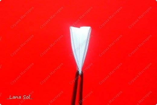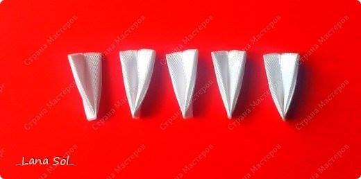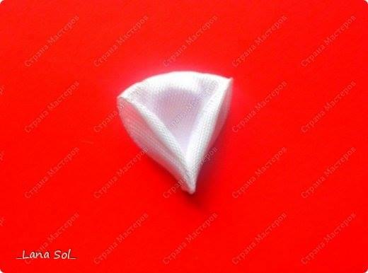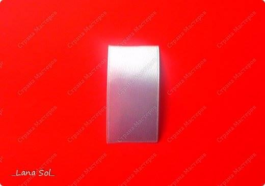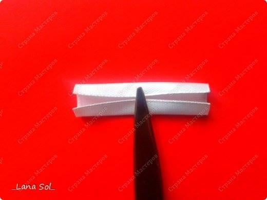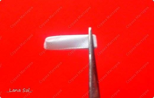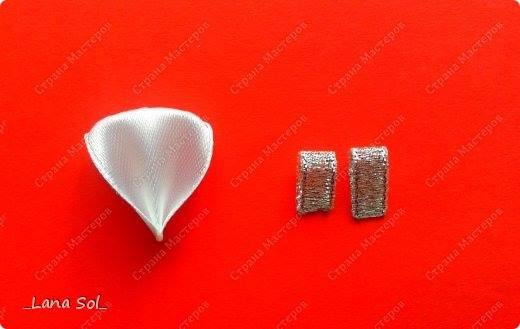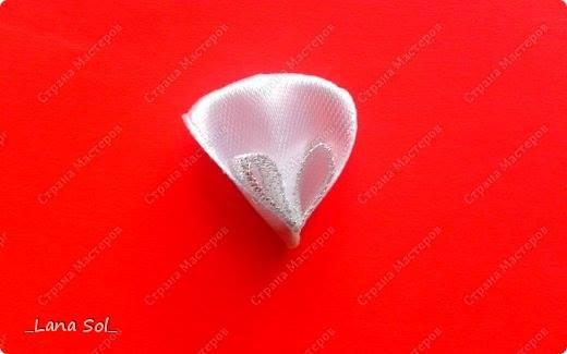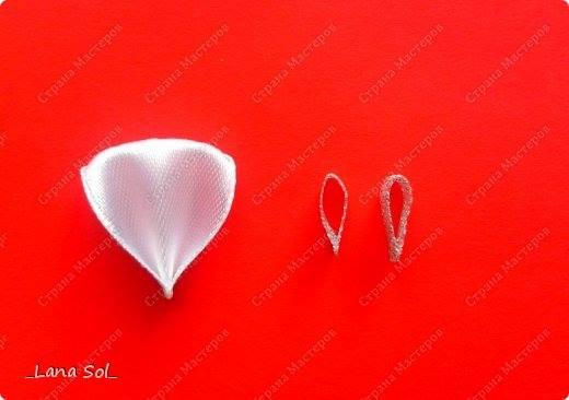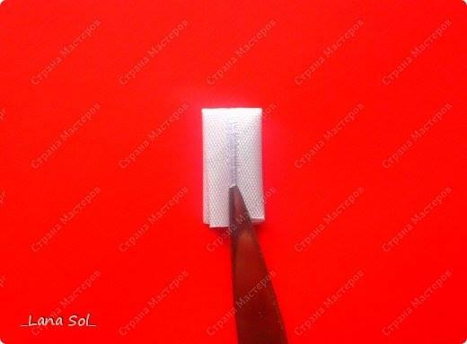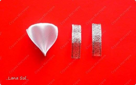 De una cinta de lúrex delgada de 0,6 cm de ancho preparamos una simple decoración para los pétalos. Doblamos dos retazos de la cinta delgada por la mitad.