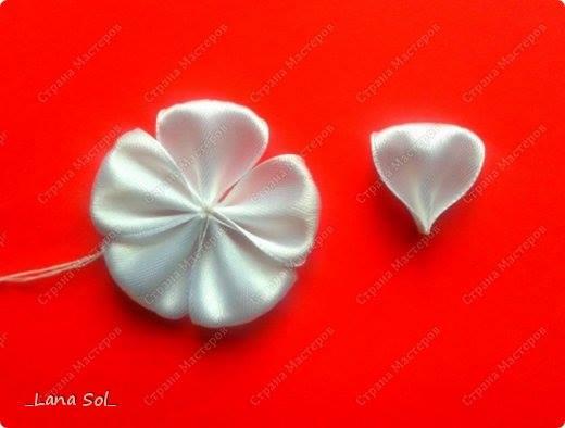 Juntamos 5 pétalos con hilo y aguja en una flor.