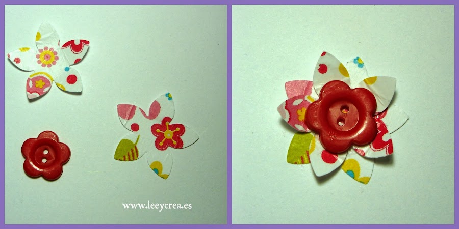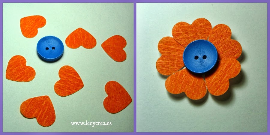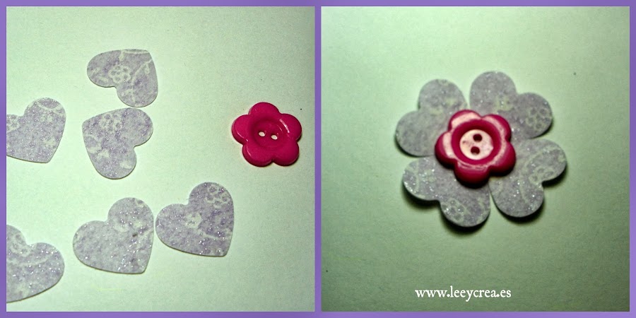 Como veis en las imágenes, crear estas flores es muy sencillo, tan solo tenemos que cortar el papel o la goma eva con la troqueladora (en nuestro caso cortamos el papel en forma de corazón y flor). Pondremos el botón en el centro y pegaremos el papel como si fueran pétalos.