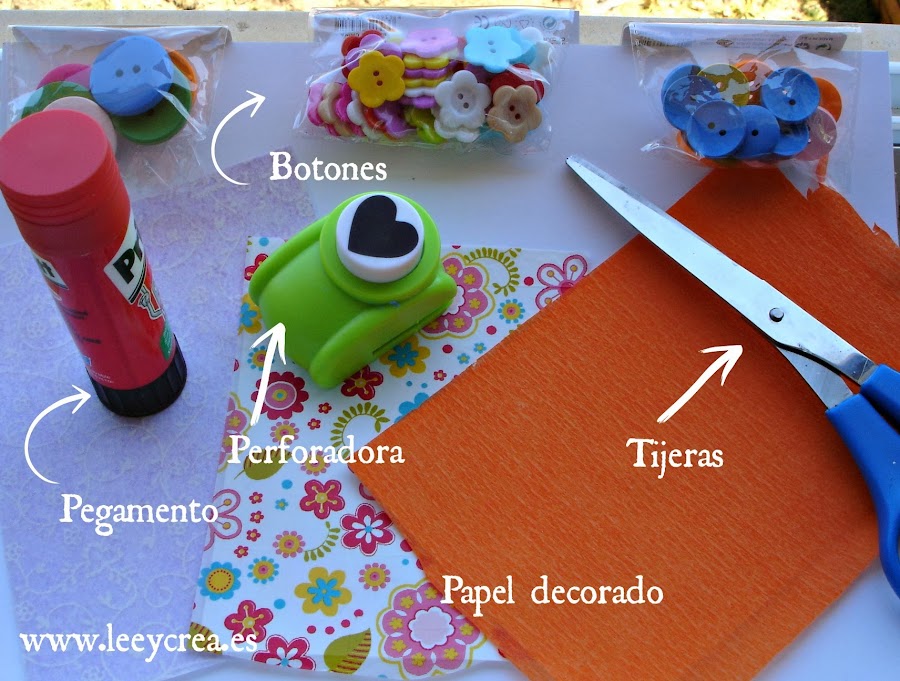 Con la combinación de botones de diferentes formas, tamaños y colores más unos originales papeles decorados, hemos creado unas bonitas flores que alegrarán vuestros regalos.