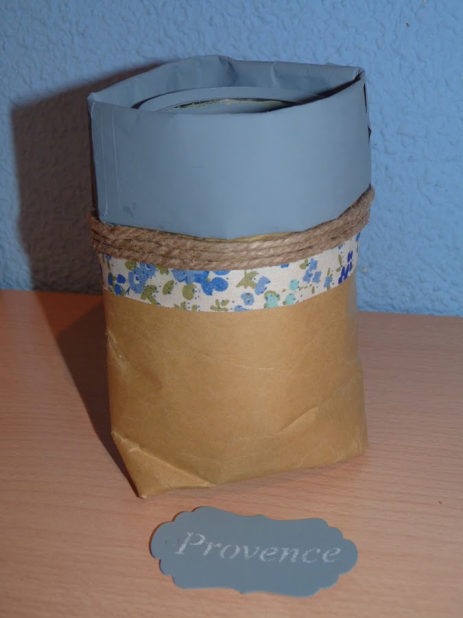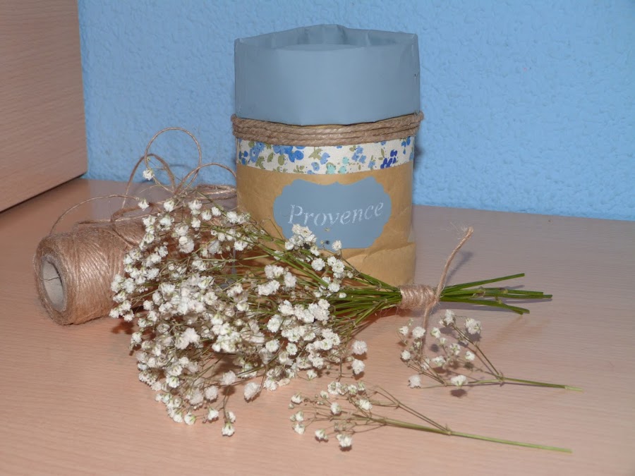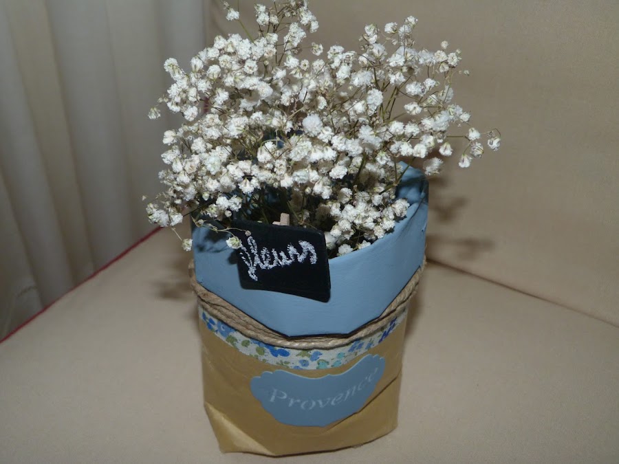 Después, cuerda, cinta adhesiva de tela con flores azules y una etiqueta pintada en el mismo color que el borde del macetero y después estarcida. Dentro del macetero he puesto una lata pintada en el mismo azul, que es la que hará las funciones de macetero o florero.