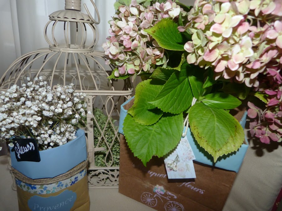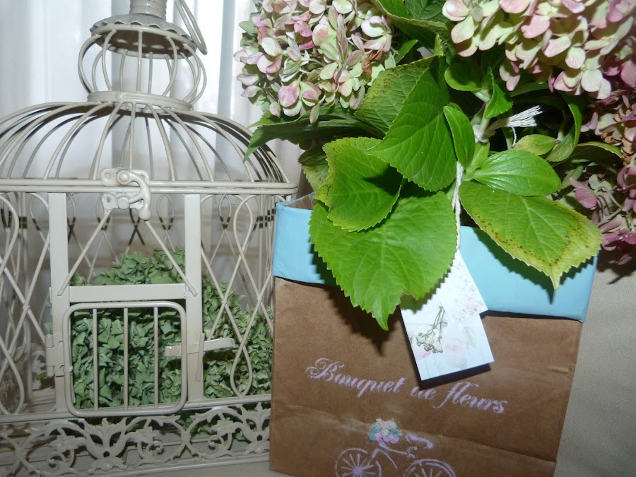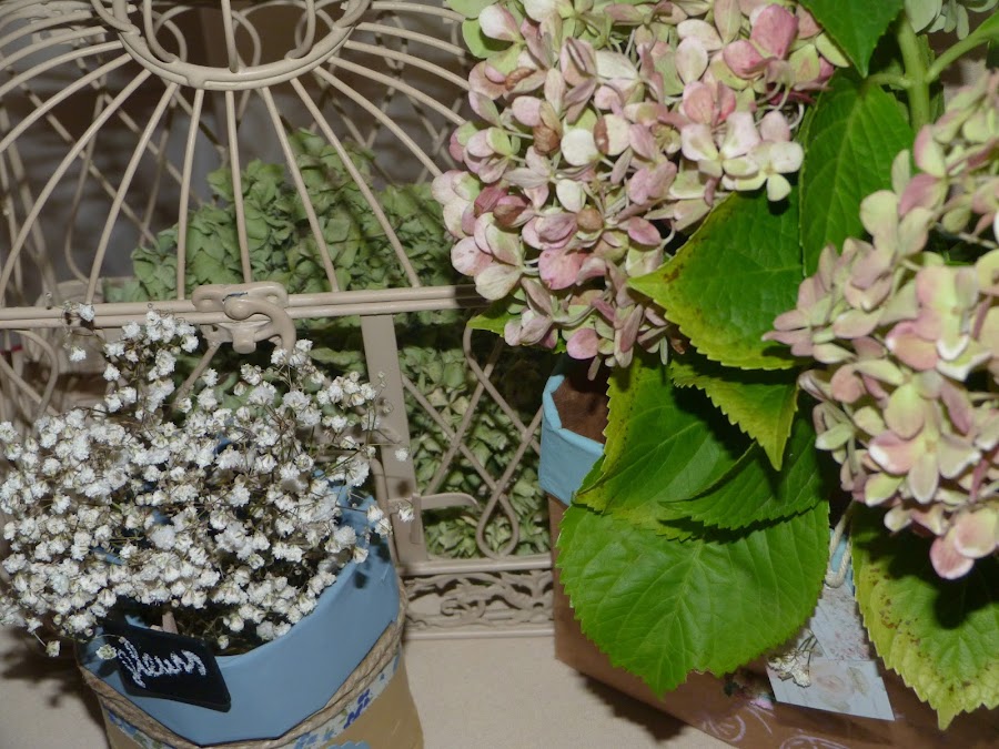 Cuando ya lo tenía terminado, mi madre me trajo unas hortensias de su jardín. Ya sabéis que las flores secas de la hortensia se dejan durante el invierno para que protejan a la planta de las heladas, y después se cortan en la época de la poda. Éstas que me trajo son todas de la misma planta, y al secarse veréis qué de tonalidades tan distintas han tomado... no sé cómo me gustan más las hortensias, frescas o secas. De momento las he puesto en agua, porque las hojas aún están verdecitas y me da pena que se sequen también.