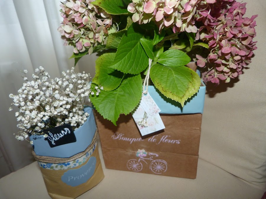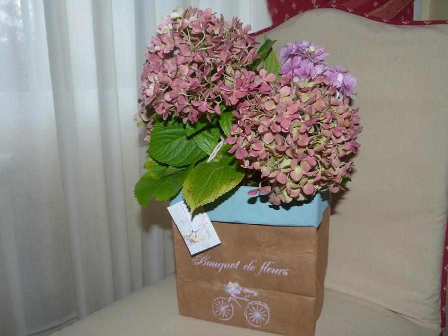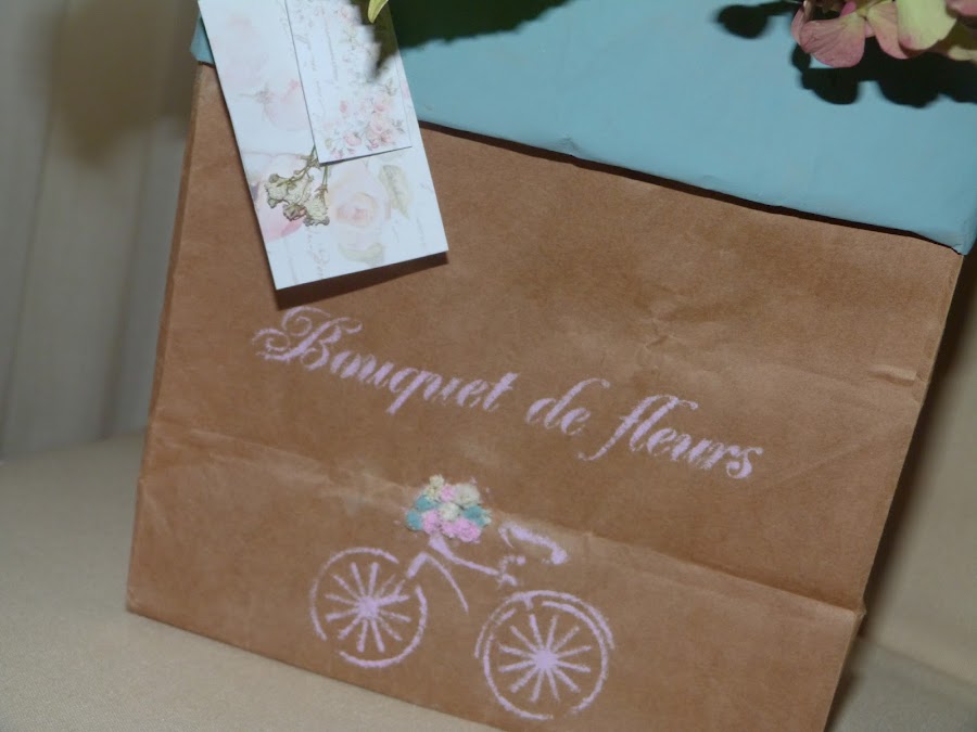 Y ya que tenía las hortensias, decidí hacer un recipiente bonito para ellas utilizando otra bolsa de papel kraft usada que tenía en casa. Di unas vueltas a la parte superior y la pinté en verde aguamarina. Después, estarcí una frase y una bicicleta vintage rosa pálido.