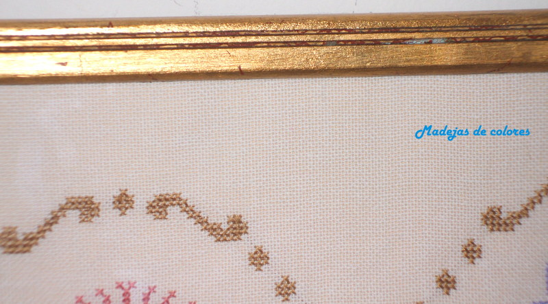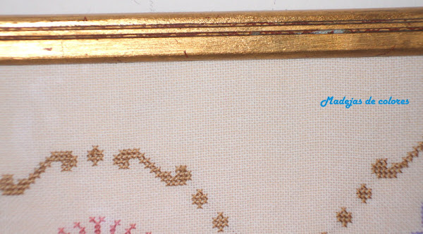 Hace unas semanas decidió darle una cambio a su dormitorio y para ello quiso aprovechar un cuadro que ya no le gustaba y para que hiciera juego con los que ya le había hecho, me pidió que volviera a hacerle unas flores a punto de cruz y el marco con pan de oro.