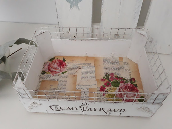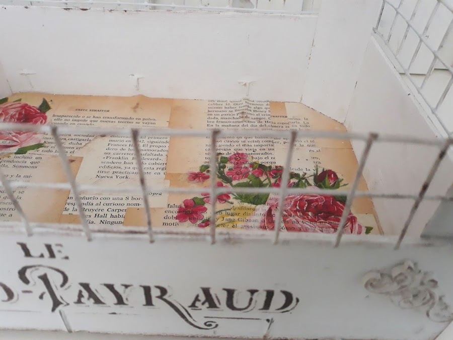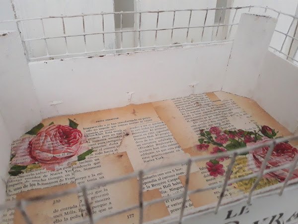 En el interior decoupage con hojas de libro y servilleta de flores.