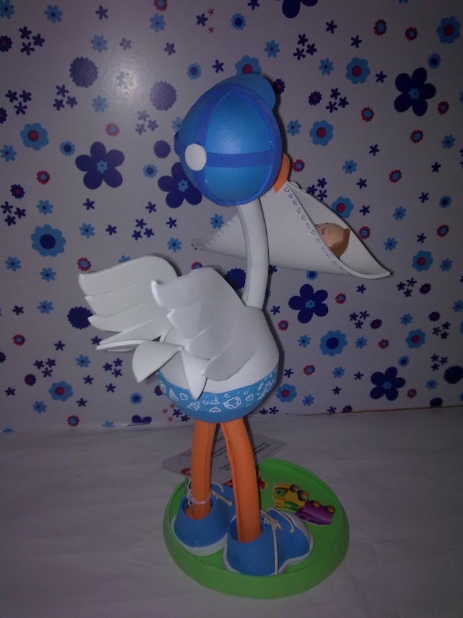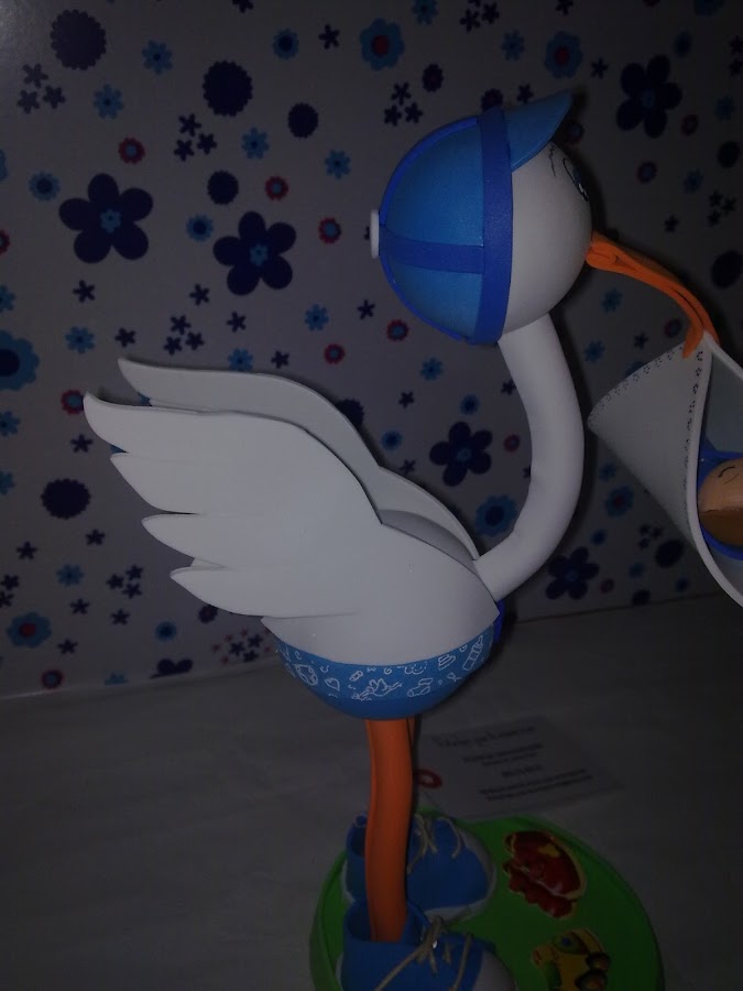 Buenas tardes a tod@s. Aquí os dejo mi último encargo que, como ya os adelanté, es otra fofucha cigüeña y otra tarta de pañales. La fofucha cigüeña en esta ocasión es de color lila. Está realizada con los mismos patrones que la cigüeña anterior, excepto el pico, que esta vez es un poco más largo y el adorno de ondulina que le he puesto en el gorro. En esta imagen veis con más detalle el latera ...