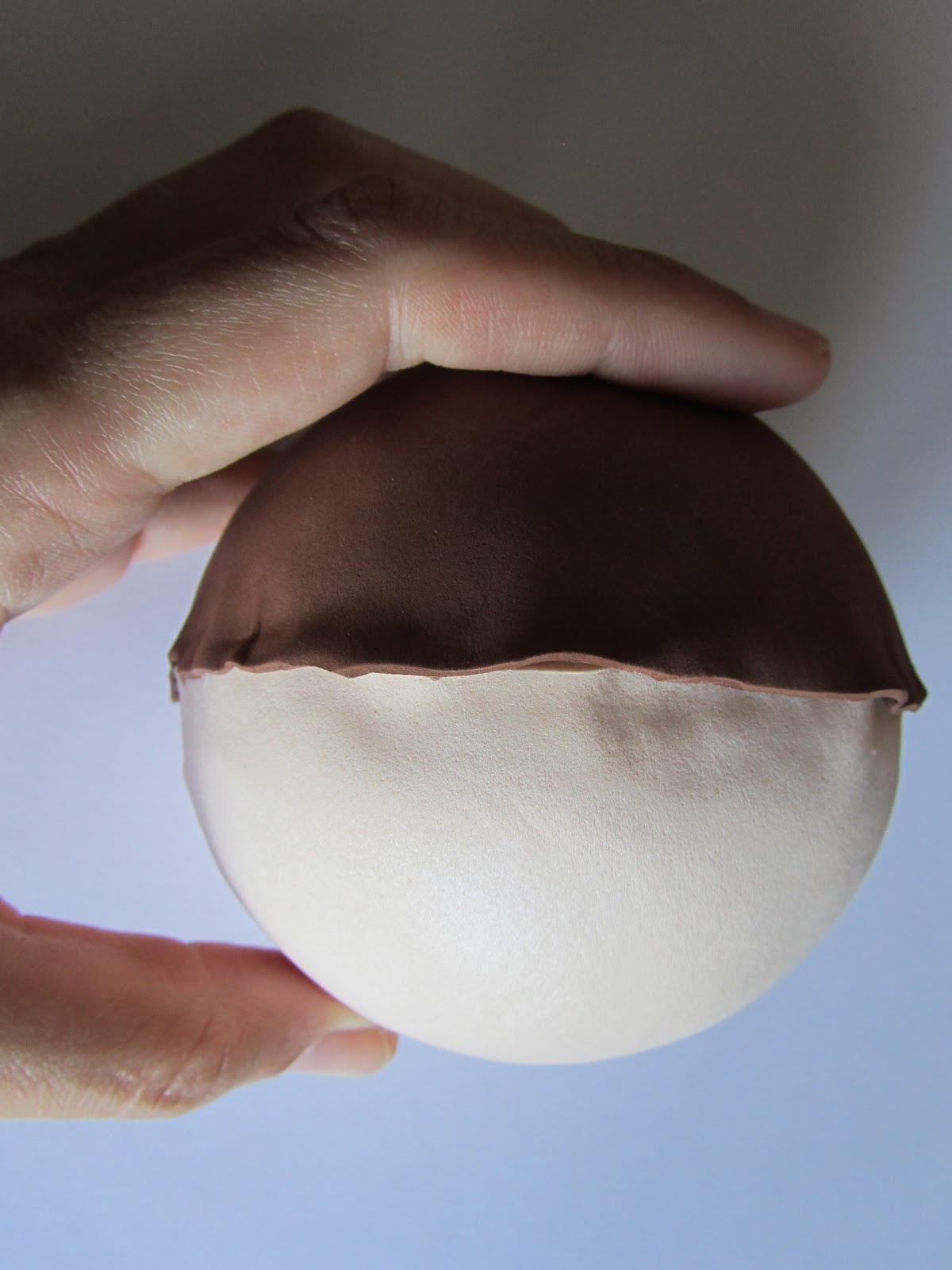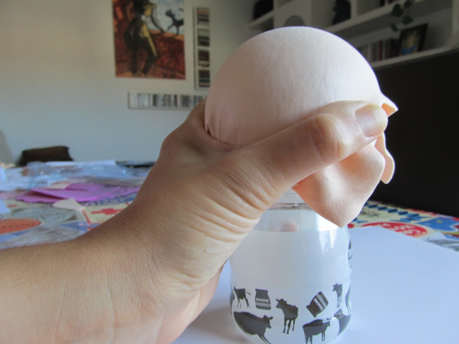 Ahora viene el turno de la plancha: coged el cuadrado de foami destinado a la cara y plancharlo (con un trapo fino por encima). No hace falta que la plancha tenga vapor, sólo es importante que esté caliente. Esto sirve para que el foami se haga moldeable. Una vez pasado por la plancha amoldar el foami en la bola grande de poliespan (estirarlo para que adquiera la forma de la mitad de la bola). Yo me ayudo con un vaso de yogur, porque así puedes apoyar mejor el poliespan mientras das forma al foami.