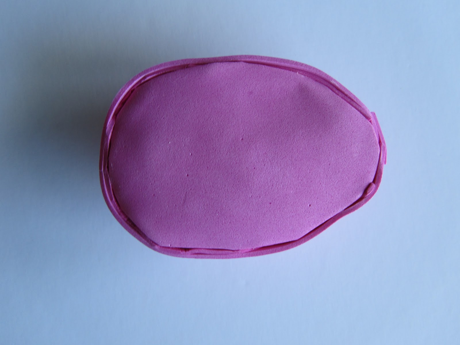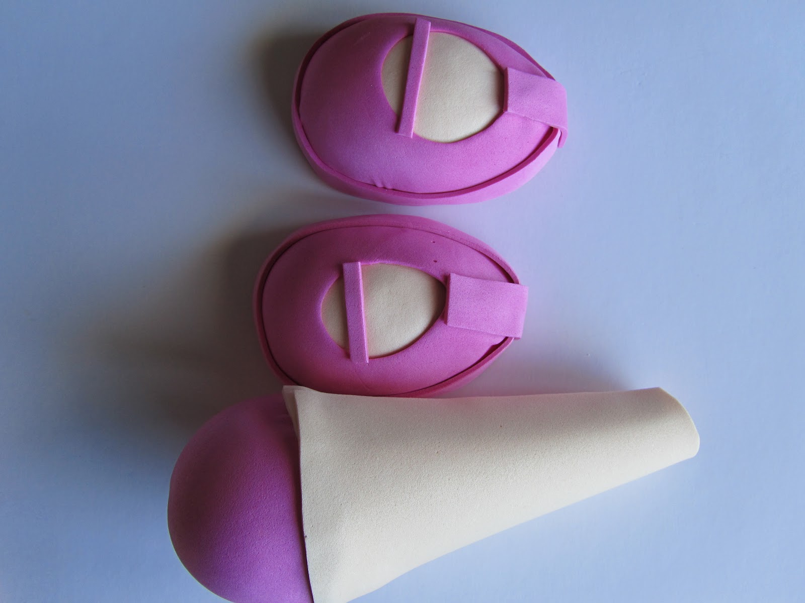 El siguiente paso puede ser hacer los pies, para ello cogemos cada uno de los cuadrados de foami de color carne, los planchamos y los adaptamos a la mitad de cada huevo. Recortamos el sobrante como antes, y repetimos la misma operación, pero esta vez con el trozo rosa de los zapatos, el que lleva una obertura. Cortamos el sobrante y pegamos cada zapato sobre un cuadrado de goma eva rosa que será la suela (el patrón que se me olvidó fotografiar). Recordad pegarlo sólo por los bordes. Recortar el sobrante. Finalmente recortamos dos tiras largas para disimular la unión de cada suela a su zapato, dos tiras cortas para tapar la unión de los extremos de cada zapato, y dos tiras finitas para decorar, si queréis.