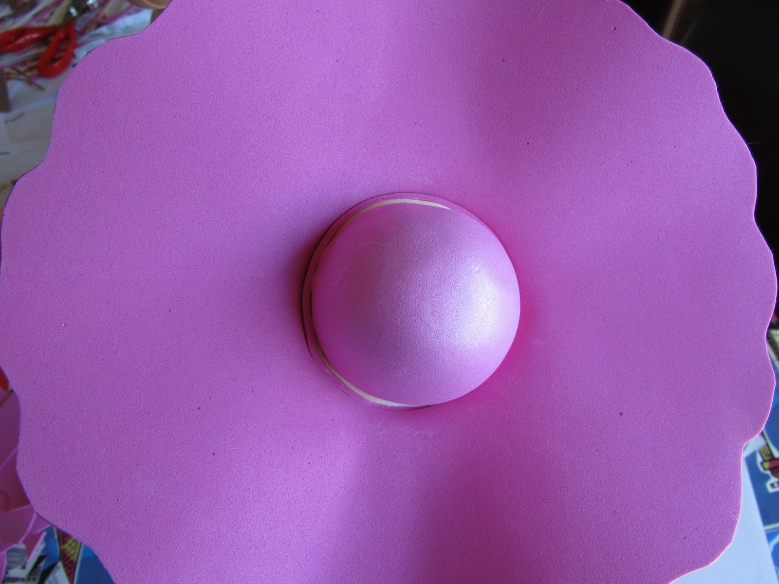 Ahora pegad el foami a la bola sólo por los bordes. En el poliespan vendrá marcada la mitad de la bola, que es por donde habéis de pegar el foami.
