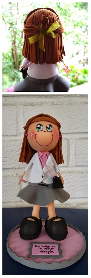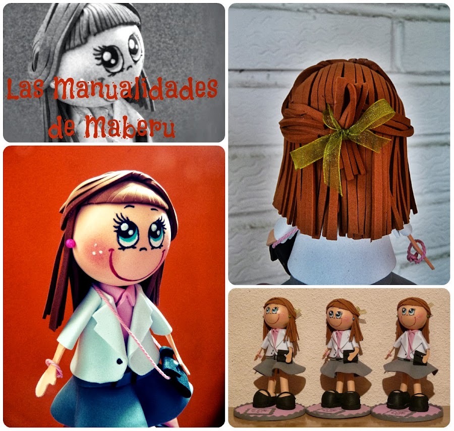 Volviendo al tema de esta entrada, se tratan de fofuchas personalizadas, basadas en la apariencia de mi tía política y amiga Charo, quien me las ha encargado. Miden unos 18 cm sobre una base redonda. Y para hacerlas he empleado goma eva de colores rosa, gris, blanco y negro.