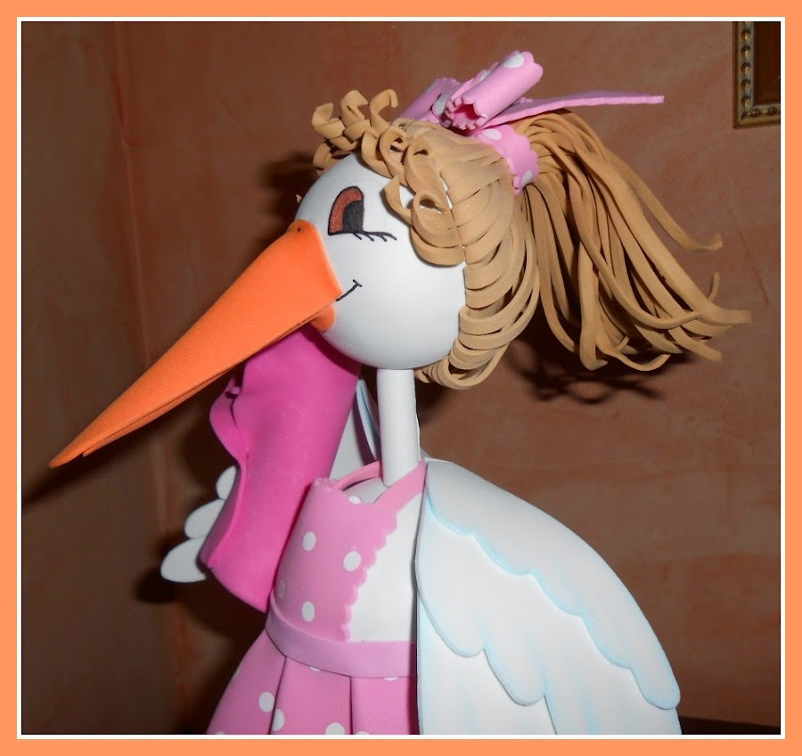 Encontré varias cigüeñas, me gusto el delantal y falda de una, pero las alas son de otra y me gusto más que llevara en brazos al bebe y no del pico como otros.