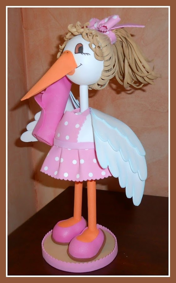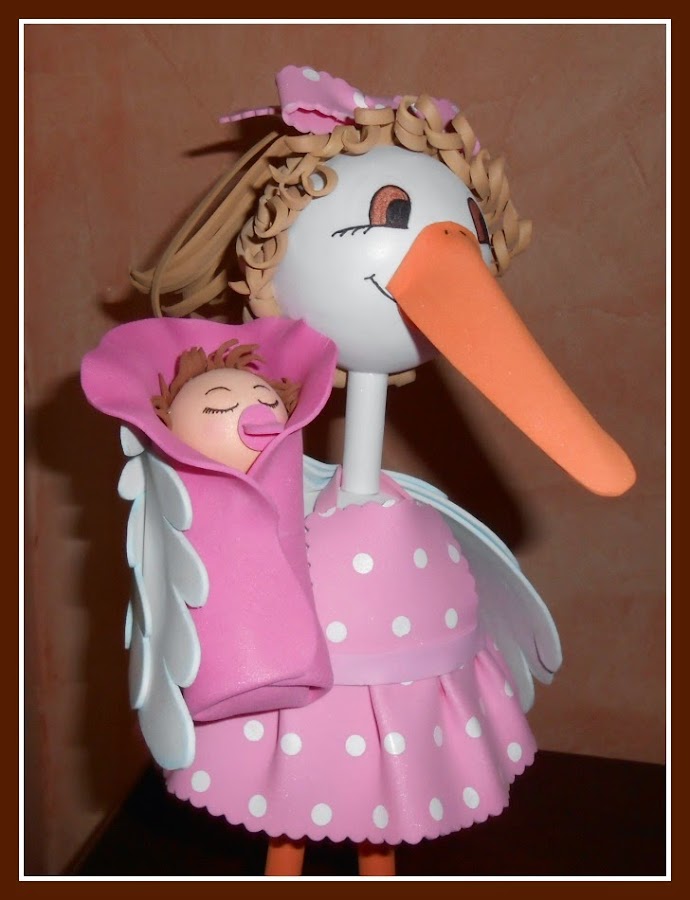 Encontré varias cigüeñas, me gusto el delantal y falda de una, pero las alas son de otra y me gusto más que llevara en brazos al bebe y no del pico como otros.