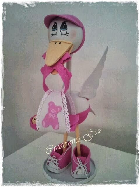 MODELO 1 Como podéis obserbar es una fofucigüeña en color rosa y blanco, con deportivas, sujetando al bebe dentro de su mantita por su pico.