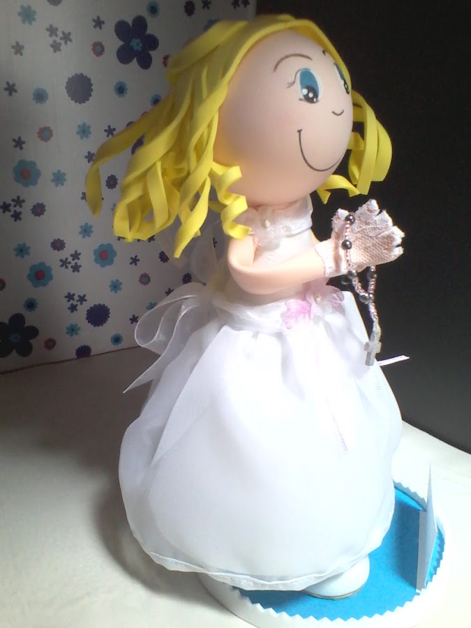 Buenas tardes a todas, ¿Que nos trae este martes? pues una fofucha de comunión. ¿Qué os parece? pensé que me quedaría peor pero al menos he conseguido un aprobado, no? jaja es que yo que la he hecho ¡Sólo veo fallos! jiji aunque poco a poco se va mejorando. Bueno pues a la próxima más Besos y a seguir laborando ?