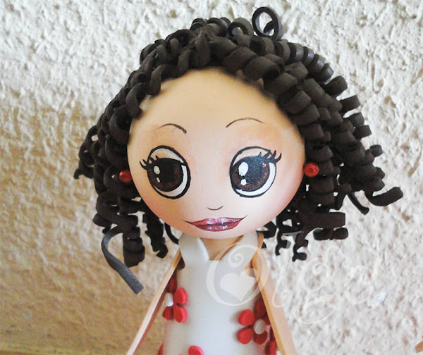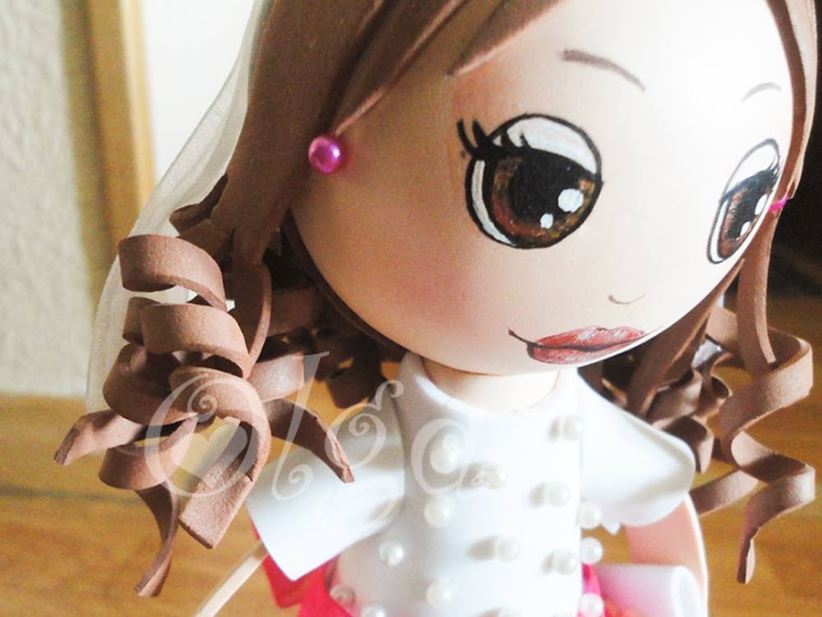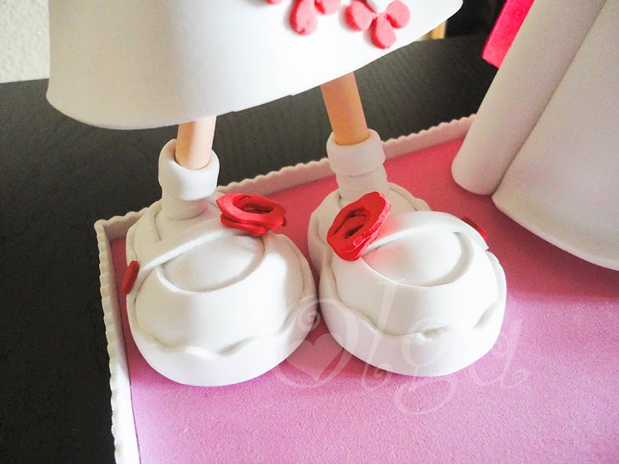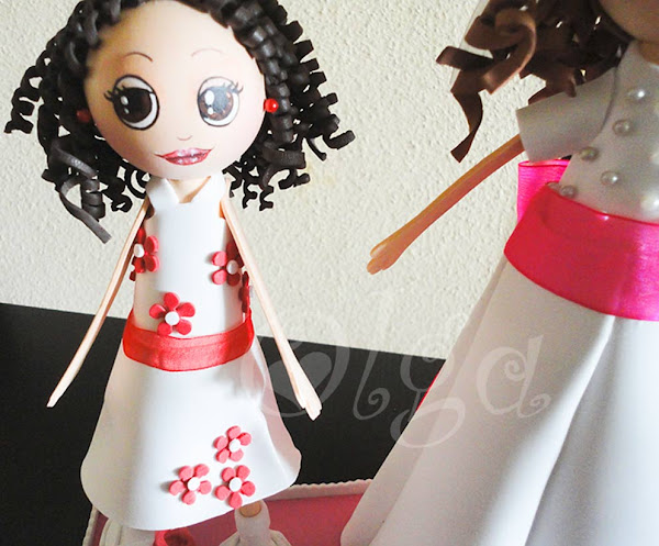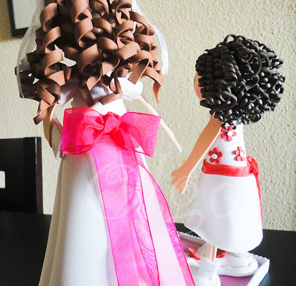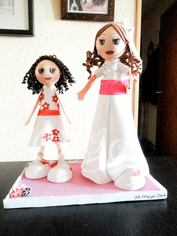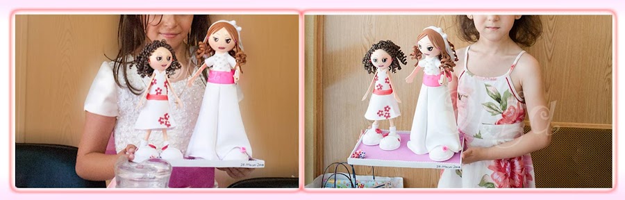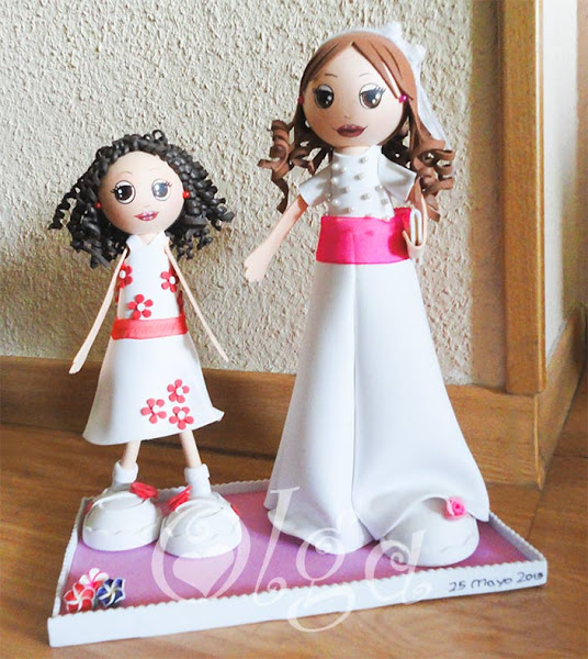 Los rizos de Neus y los tirabuzones de Luna , con sus adornos y sus pendientes, los zapatitos , el libro que Luna llevaba, todo montado sobre una base rosa con unas florecitas de fimo.