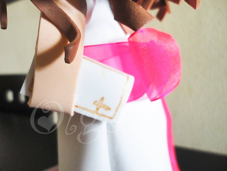 Reprodujo con exactitud el precioso vestido con el cuerpo decorado con minúsculas perlas y el fastuoso lazo de organza magenta.
