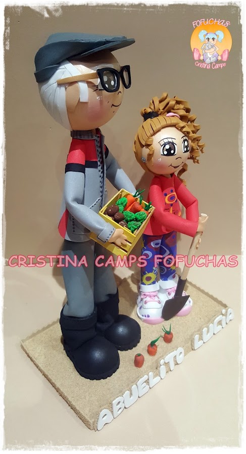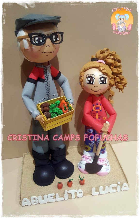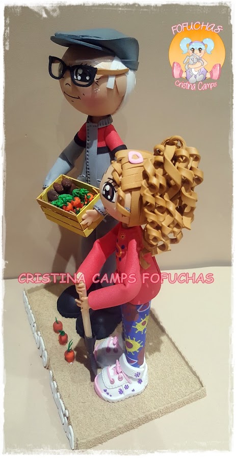 Buenas y frías noches! Os traigo una fofucha de una nena preciosa y su abuelito, les gusta mucho compartir su tiempo en el huerto, así que le he puesta una caja de hortalizas a el abuelo y una pala a Lucia. Espero que les haya gustado mucho.