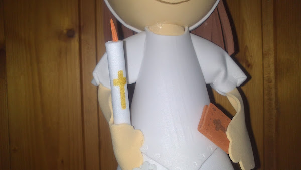 Volvemos con otra fofucha, en esta ocasión un regalo para Sara. El sábado 25-5-2013 hace su primera comunión Sara, ¿ os acordáis de la vuestra?, de la mía hace ya mucho tiempo pero no puedo olvidarme de los nervios que pasé, la noche anterior no pude dormir. Todas las niñas esperan ese gran día con mucha ilusión, todos los preparativos son importantes. Los zapatos son blancos con un broche en forma de flor haciendo juego con su diadema y la perla en el centro como lleva en el vestido, sus calcetines blancos que como toda su ropa interior es especialmente elegida para ese gran día. En sus manos la hemos puesto una vela para que ilumine con su luz y no la pierda nunca, en la otra mano lleva un libro el cual representa todo lo que va a festejar con su familia y amigos.